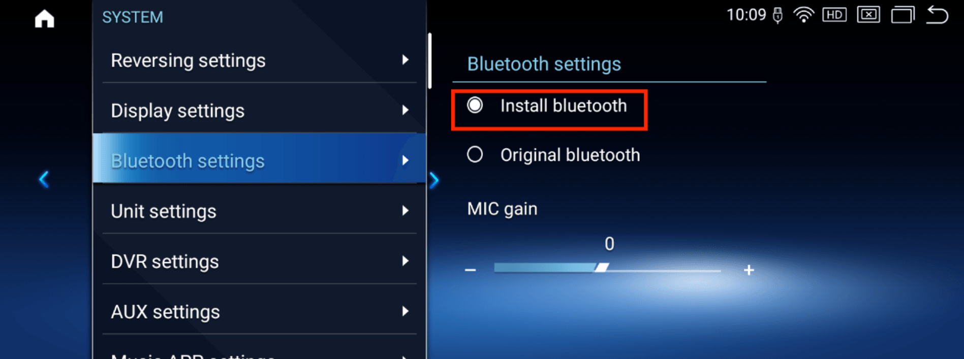 System →Bluetooth settings → Select "install Bluetooth" Option - Enable Background Connection (ensures auto-connect when entering the vehicle).