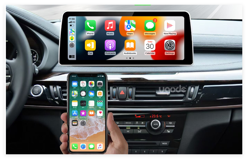 Let’s start by looking at two real-life photos of CarPlay displayed on Mercedes and BMW screens. Have you noticed that even on similarly structured ultra-wide screens, CarPlay appears differently? On the Mercedes infotainment display, it doesn’t show in full screen, while on the BMW screen, it expands to full screen.
